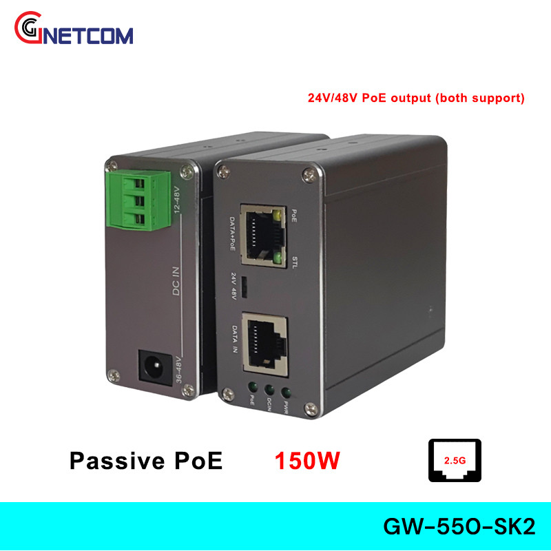 Industrial PoE Injector, 2*10/100/1000/2500Mbps RJ45 ports, 24V/48V PoE output (both support), maximum output power of 150W (PoE Pin: 1236+ 4578-), DC: 12V-48V input, wide temperature range (-40-75 ° C), DIN rail/wall mounted; |