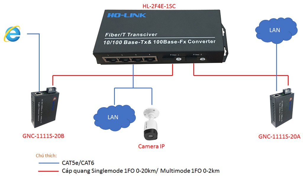 - Khoảng cách: 20km trên cáp quang Single mode.